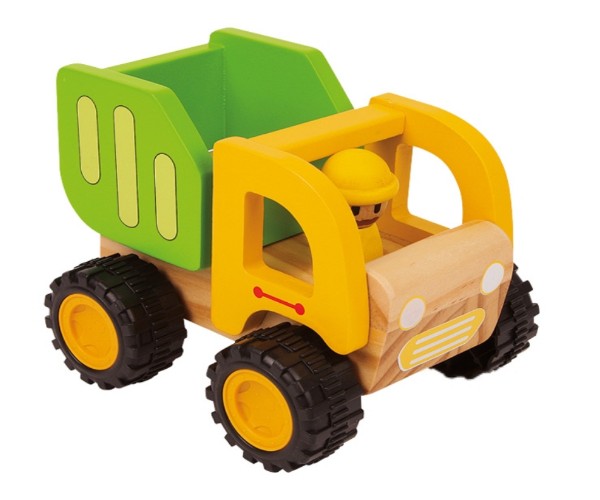 Camion con ribaltabile in legno massiccio parzialmente colorato, munita di portellone apribile e figura ad incastro (6,5 x 2,5 cm), le assi in metallo e le ruote di gomma le conferiscono un'alta scorrevolezza. L'accentuato profilo delle ruote fa sì che il veicolo imita il rumore del motore facendo così più emozionante il gioco dei piccoli conduttori!